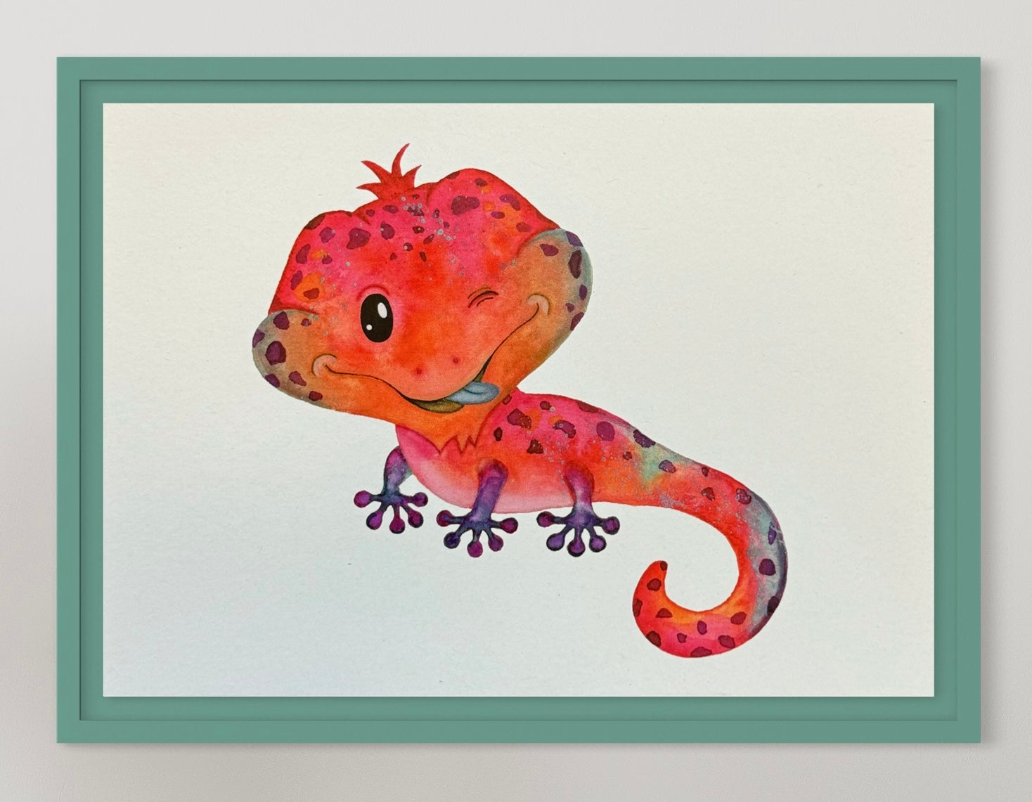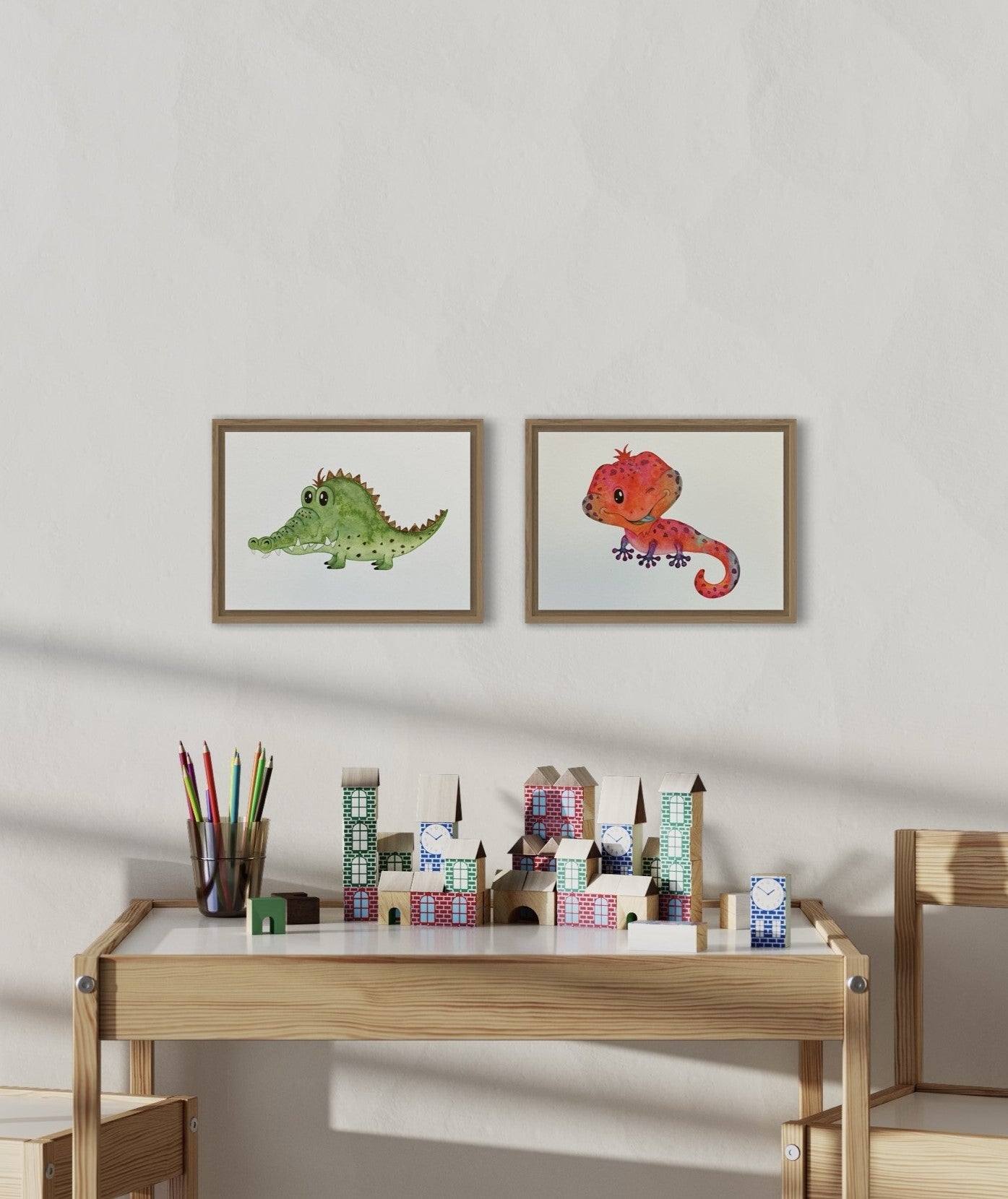 Den frække øgle kan pynte på væggen alene, eller sættes sammen med andre dyr. Øglen findes også på ABC plakaten med dyr.