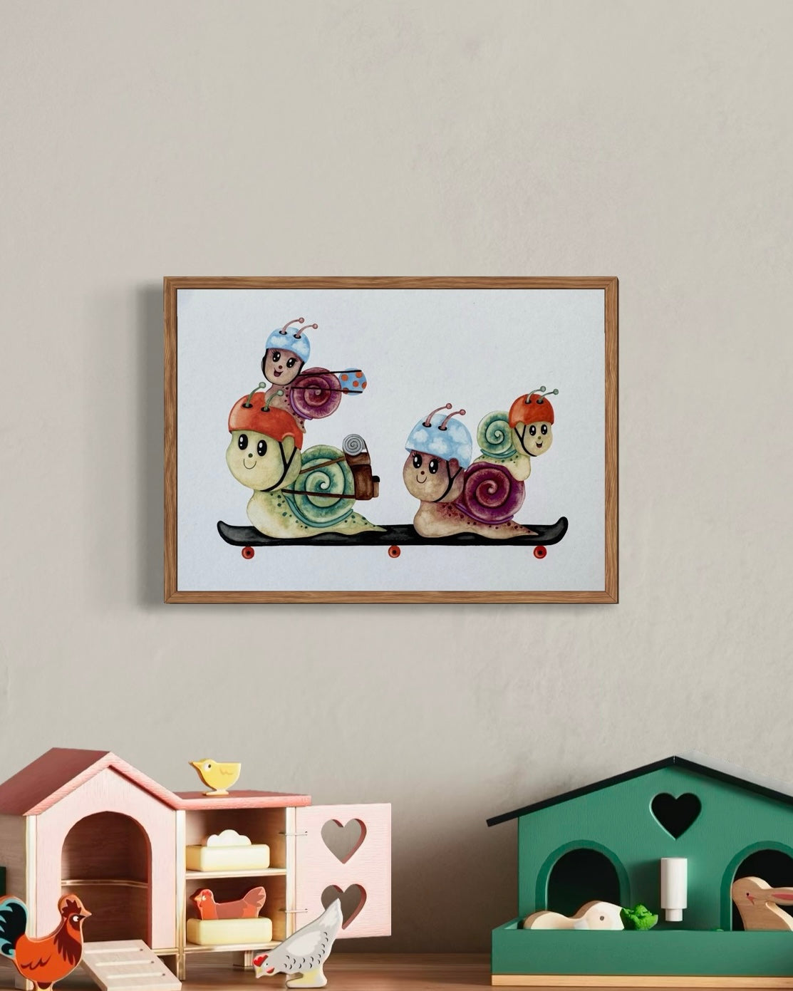 Den lille sneglefamilie har spændt hjelmene og er klar til at tage på tur. Hvor mon de skal hen?