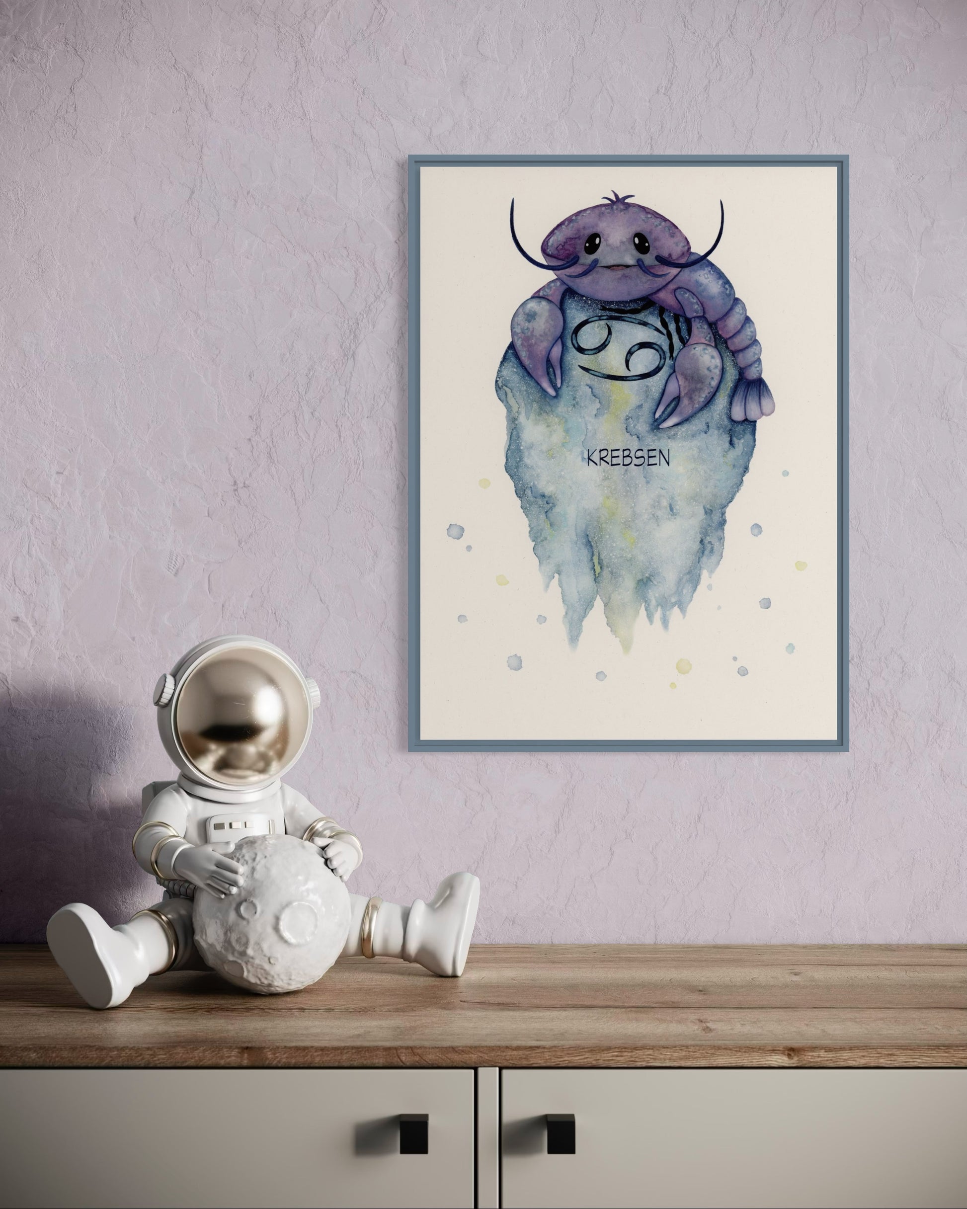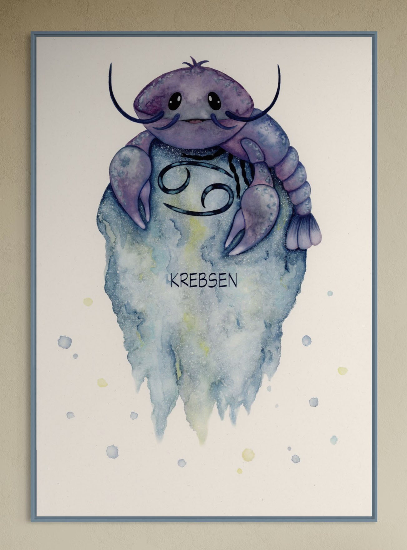 Den sjove Krebs er håndtegnet og malet med akvarel i lilla, gule og blålige nuancer hvor den blå farve repræsenterer elementet vand.